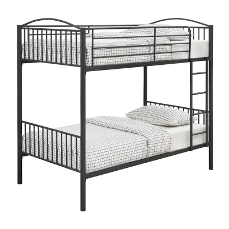 Proudly place this twin over twin bun bed in your youth's sleeping space. Coming in a gunmetal or silver finish, this piece is designed with heavy gauge steel construction. A curved head and footboard on the top bunk adds a touch of character to this stylish bunk bed. Using an attached ladder, little ones can easily access the top bunk. Use this bunk bed in compact bedrooms to help save space.