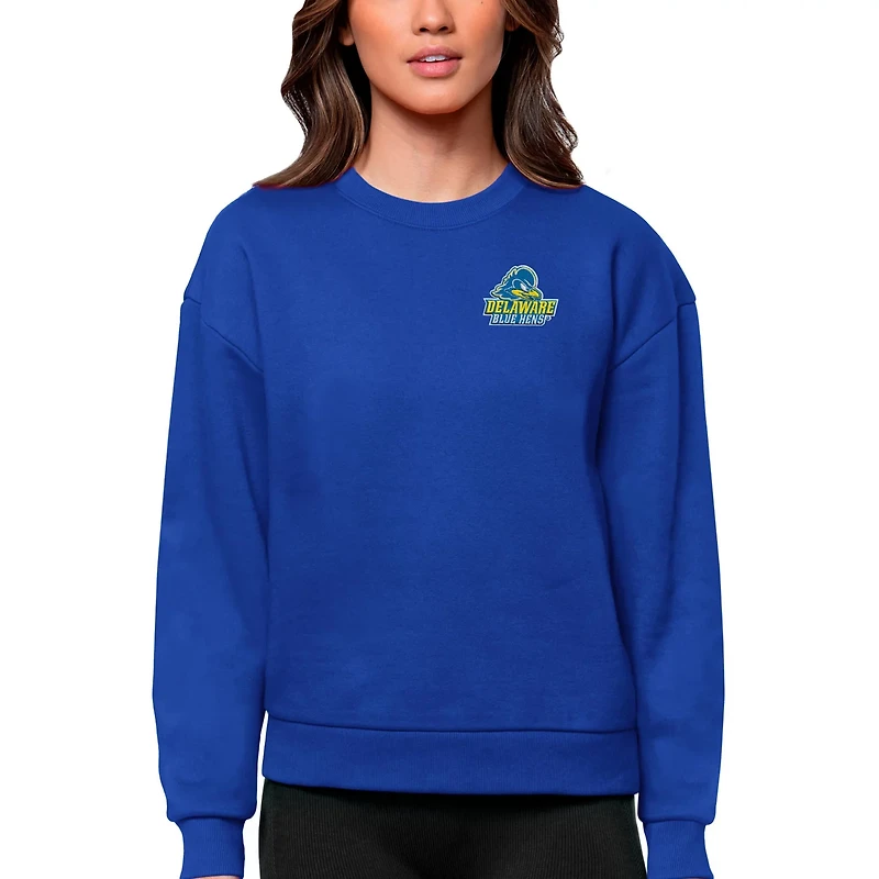 The Women's Antigua Royal Delaware Fightin' Blue Hens Logo Victory Crewneck Pullover Sweatshirt is the perfect way to show your support for the Delaware Fightin' Blue Hens Made from a comfortable cotton and polyester blend this lightweight sweatshirt is perfect for mild temperatures Embroidered graphics proudly display your Delaware Fightin' Blue Hens pride while ribbed cuffs neck and bottom opening provide a snug and comfortable fit