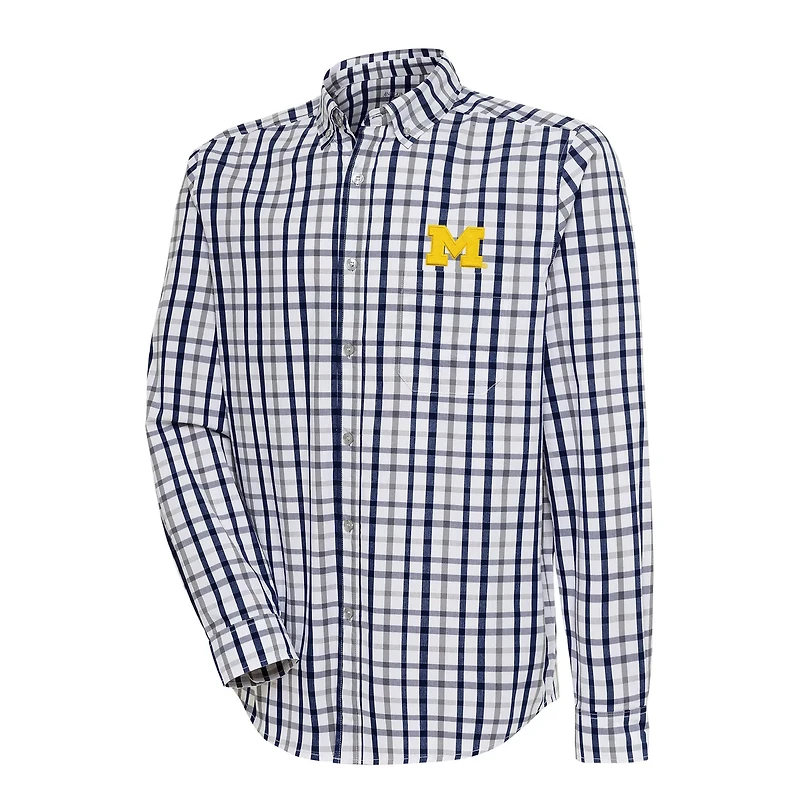 Elevate your Michigan Wolverines game day look with the refined style of this Antigua Tending 2 Button-Down Long Sleeve Shirt Made from a lightweight and comfortable tri-blend fabric this shirt is ideal for casual and business settings The plaid design offers a classic and timeless look that never goes out of style making it a versatile addition to any Michigan Wolverines fan's wardrobe