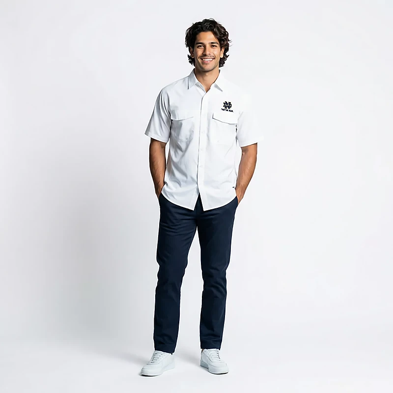 Root for your favorite team when you wear the Antigua Men's Notre Dame Fighting Irish Game Day Fishing Shirt. It is made of 93% polyester and 7% spandex. The UPF 50+ provides protection from the sun, and its split back yoke improves breathability. The Notre Dame Fighting Irish icon is embroidered on the left-side chest pocket, showing off your team spirit.