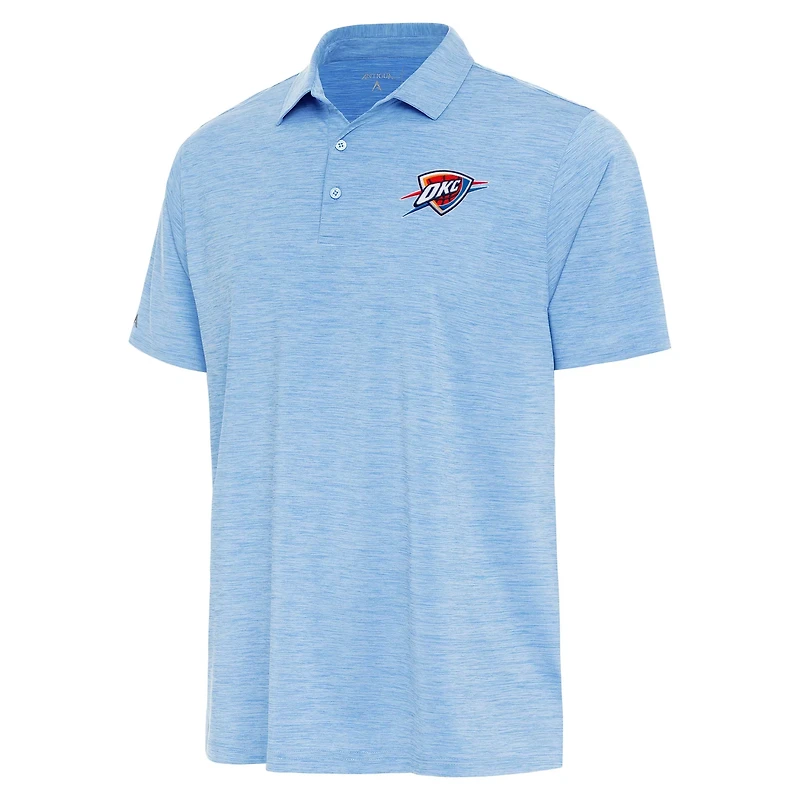 Show off your fandom for Thunder with the Antigua Men's OKC Thunder Layout Short Sleeve Polo Shirt. The 93% polyester and 7% spandex signature heathered matte poly construction offers long-lasting use and a stretchy feel, and the OKC Thunder embroidered design makes it clear you're a fan. The matte logo buttons and an Antigua ‘A’ on right sleeve delivers your brand pride, and the side vents provide airflow.
