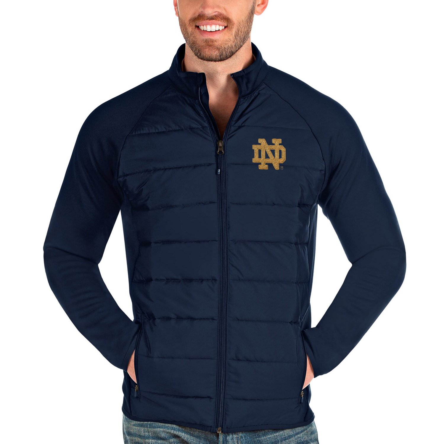 Stay warm and show your Notre Dame Fighting Irish pride with this Antigua Altitude Full-Zip Jacket This Notre Dame Fighting Irish jacket features a nylon quilted front panel and a stand-up collar to keep you warm and stylish The embroidered graphics and dyed-to-match binding add a touch of team spirit Whether you're cheering on the Fighting Irish at Notre Dame Stadium or watching from home this jacket will keep you warm and stylish all season long