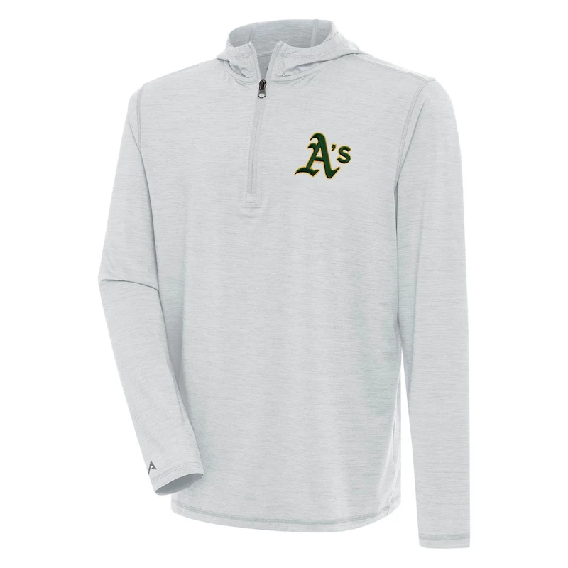 The Men's Antigua Heather Gray Oakland Athletics Tidy Quarter-Zip Hoodie is the perfect way to show your support for the Oakland Athletics Made of lightweight polyester and spandex this hoodie is perfect for mild temperatures and features heat-sealed graphics that showcase your Oakland Athletics pride Whether you're cheering at the stadium or relaxing at home this hoodie will make you feel like part of the team