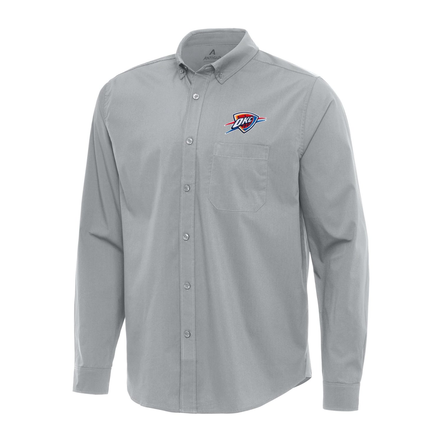Elevate your Oklahoma City Thunder game-day look with the Antigua Flight Woven Tri-Blend Long Sleeve Button-Down Shirt This tri-blend button-down shirt is crafted for comfort with a touch of team spirit Its pleated back allows for a full range of motion making it perfect for cheering on the Thunder from the stands or sporting a touch of team pride in everyday settings