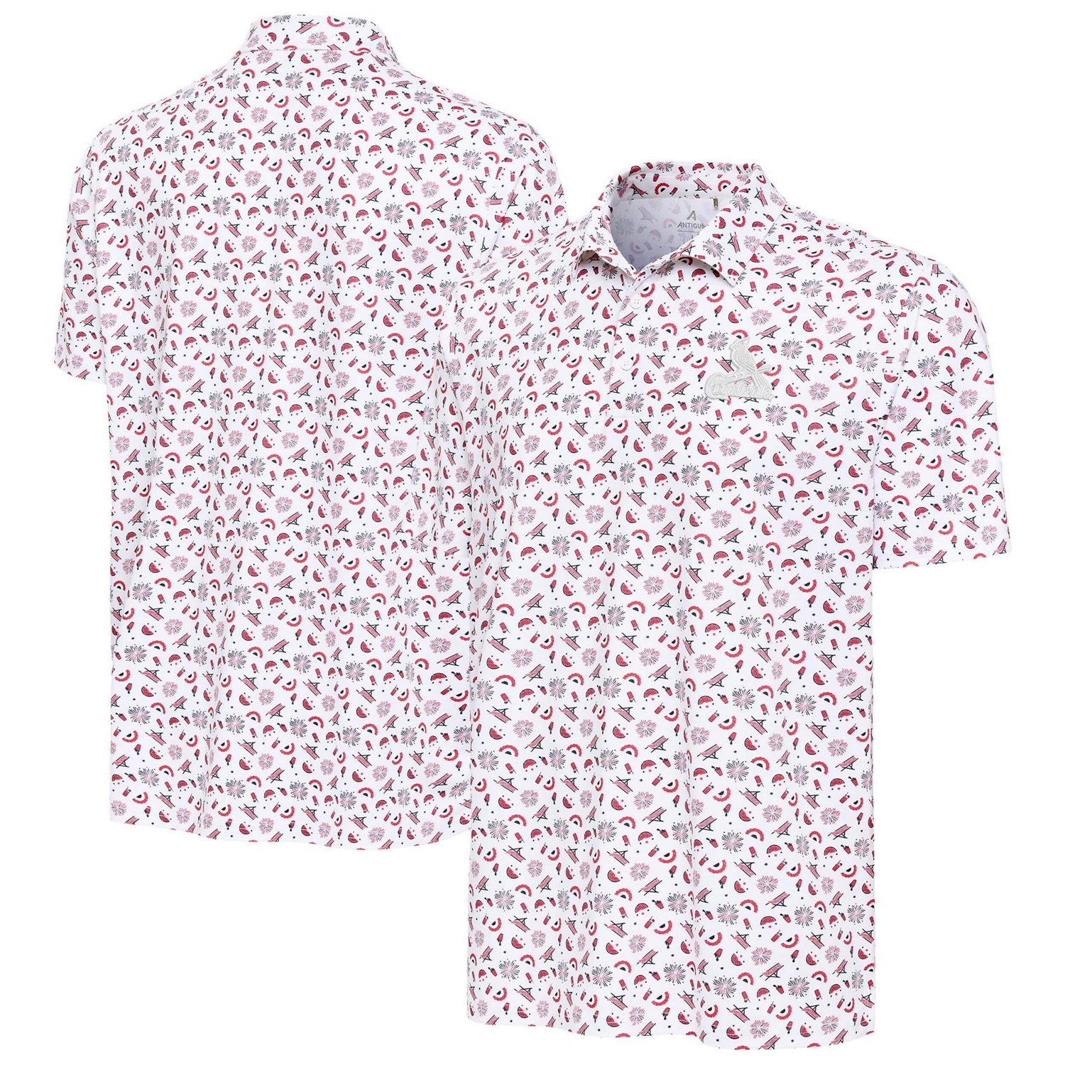 Rep the St Louis Cardinals with this Antigua Independence Day Polo This polo boasts a festive Independence Day celebration themed print allowing you to show your St Louis Cardinals pride in style Constructed with a blend of polyester and spandex it provides a comfortable flexible fit that's perfect for warm weather