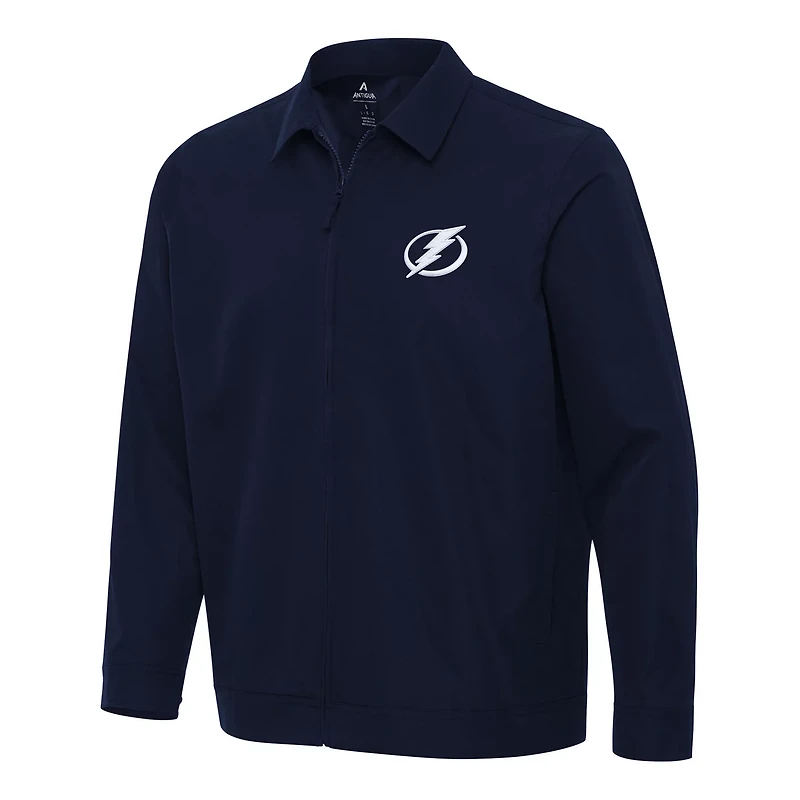 Add this Tampa Bay Lightning Pivot Full-Zip Jacket from Antigua to your game day wardrobe This stylish jacket features a classic full-zip design and a fold-down collar making it perfect for layering over your favorite Tampa Bay Lightning gear The embroidered team logo on the left chest proudly displays your fandom while the two front pockets provide convenient storage for your essentials