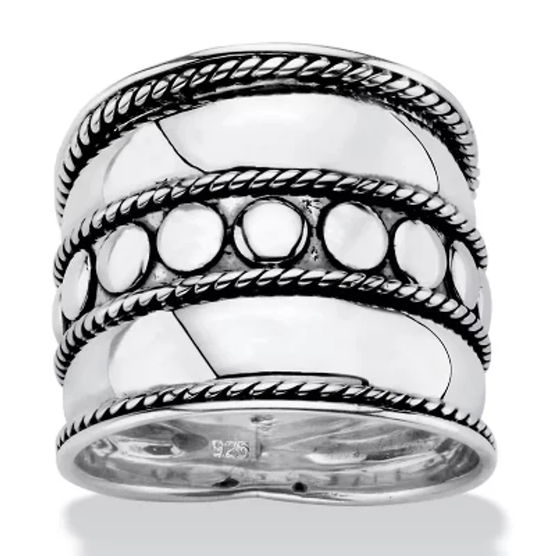 Perfect for your most Bohemian outfit, this wide band ring is unique and oh-so-chic. The cigar band-style ring has a Bali-bohemian influence that's bold but feminine. Crafted in antiqued sterling silver with beaded and rope detailing, this band will be your favorite go-to piece. Sizes 6-10. We recommend that you order one size up for this style.Sterling Silver; Contains 11.00 grams of Sterling SilverMeasures: 21 mm wide x 18 mm long x 2 mm high; Shank Width: 9.0 mm wideIncludes gift box and drawstring pouchSterling SilverContains 11.00 grams of Sterling SilverShank Width: 9.0 mm wideDimensions: 21 mm wide x 18 mm long x 2 mm highIncludes gift box and drawstring pouch Polished finish Warranty available Thailand Imported Product Specifications 0.91 in x 0.71 in x 0.83 in Material & Care Metal, Sterling silver Clean with a soft cloth.