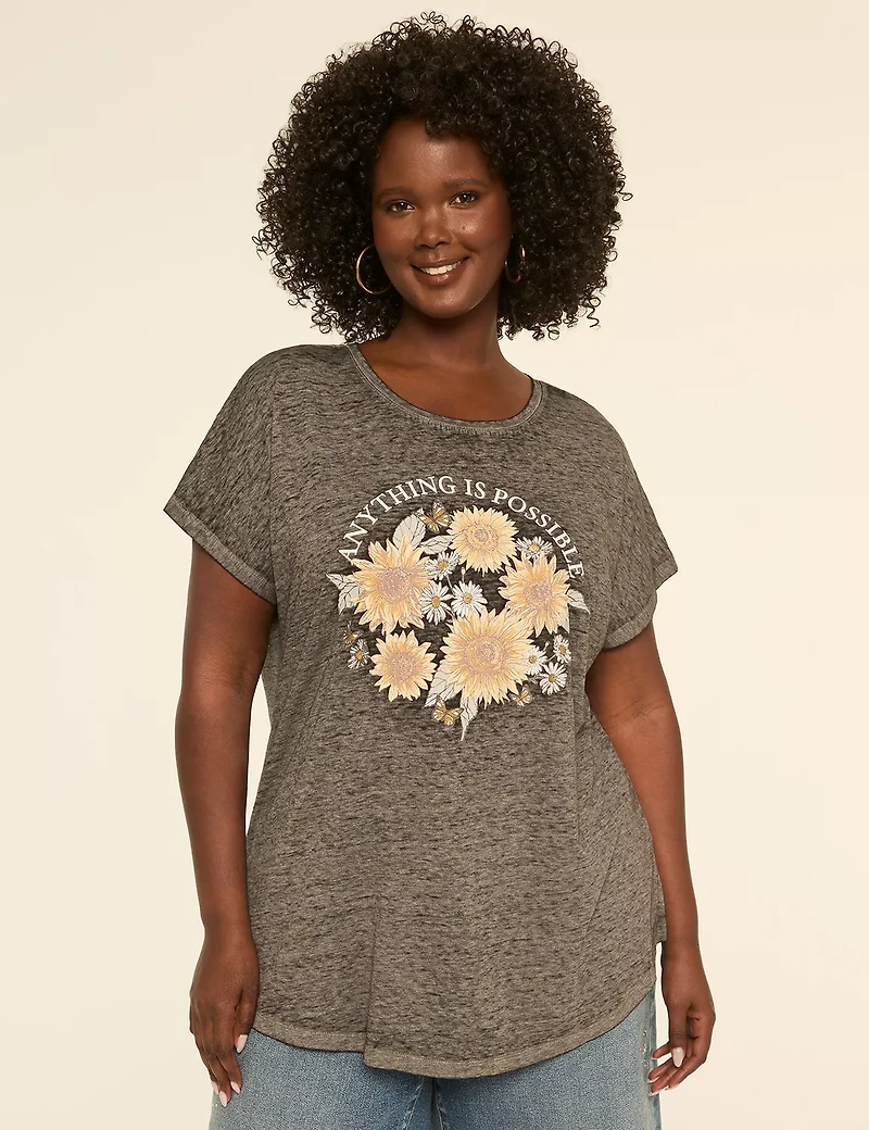 Available in Plus Size Bring a little optimism to your wardrobe this season with this soft graphic tee and its "Anything Is Possible" message. FIT: Classic. Designed for curves and a not-too-tight, not-too-loose, just-right fit. Front Body Length From Shoulder: 31" (On Size 18) Longer length is perfect for added coverage. FEATURES: Scoop neck Short dolman sleeves FABRIC: Soft, stretchy jersey knit Machine Wash Cold With Like Colors; Only Non-Chlorine Bleach When Needed; Tumble Dry Low; Cool Iron If Needed 55% Cotton/45% Polyester Item Number #414951 Imported Plus Size Top ". Plus Size Anything Is Possible Graphic T-Shirt, in Black, 22/24, Women's, Lane Bryant