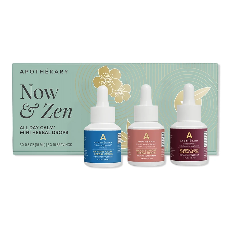 NOW & ZEN SET. Benefits: Ros-Tinted Glasses (with Cherry Blossom)Supports emotional well-being* Helps maintain mental clarity* Promotes a sense of calm* Provides antioxidant support* Supports skin health from within*. Take The Edge Off (with Yuzu) Helps the body manage occasional stress* Supports relaxation of physical tension* Helps maintain a calm mood* May reduce occasional restlessness* Supports natural sleep rhythms*. Wine Down (with Japanese Maple Leaf) Supports relaxation* Helps maintain restful sleep patterns* May ease occasional tension* Supports physical comfort during times of stress*. Key Ingredients: Ros-Tinted Glasses with Cherry Blossom: Schisandra Berry: Supports mood and a healthy stress response* Hibiscus: Supports a healthy inflammatory response* Rosehip: Supports skin and healthy immunity* Lion's Mane Mushroom: Supports cognition and focus*. Take The Edge Off with Yuzu: Passionflower: Supports relaxation and stress relief* Skullcap: Helps ease occasional tension* Oatstraw: Soothes a taxed nervous system* White Mulberries: Supports a healthy inflammatory response*. Wine Down with Japanese Maple: California Poppy: Helps ease occasional discomfort and promotes restful sleep* Hawthorn Berry: Help calm stress and nerves* Blue Vervain: Supports relaxation, comfort, and restful sleep* L-Theanine: Calms the mind and body*. Certified Gluten-Free, Non-GMO, Third Party Tested. Includes: Ros-Tinted Glasses with Cherry Blossom: Inspired by ros wine, this mood-brightening tincture offers juicy strawberry flavor with tart and floral notes, softened by the delicate sweetness of cherry blossom.. Take The Edge Off with Yuzu: Inspired by your favorite white wine, this bright and balancing blend combines citrusy, honey-like notes with the refreshing zest of yuzudelicious on its own or in sparkling water.. Wine Down with Japanese Maple: Inspired by a full-bodied glass of red, this grounding tincture features deep berry notes accented by cinnamon, black pepper, and Japanese maple..