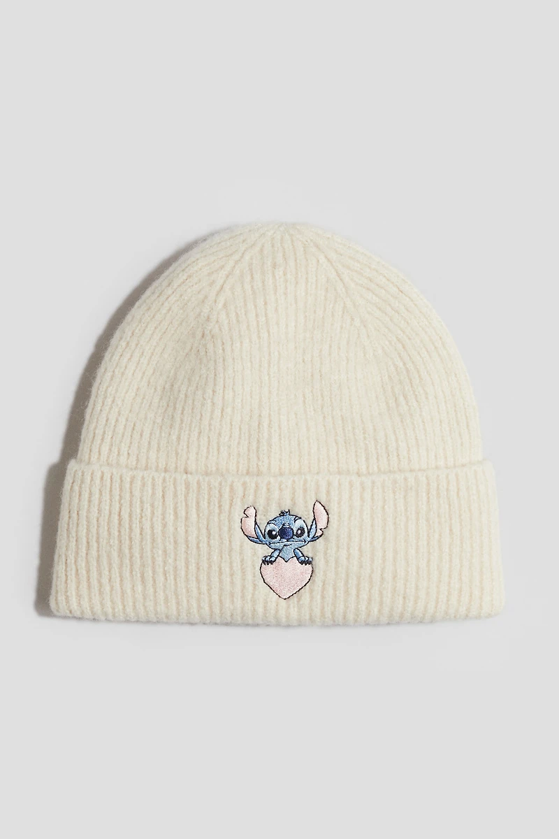 Soft, rib-knit beanie. Embroidered appliqué at front and a foldover cuff.