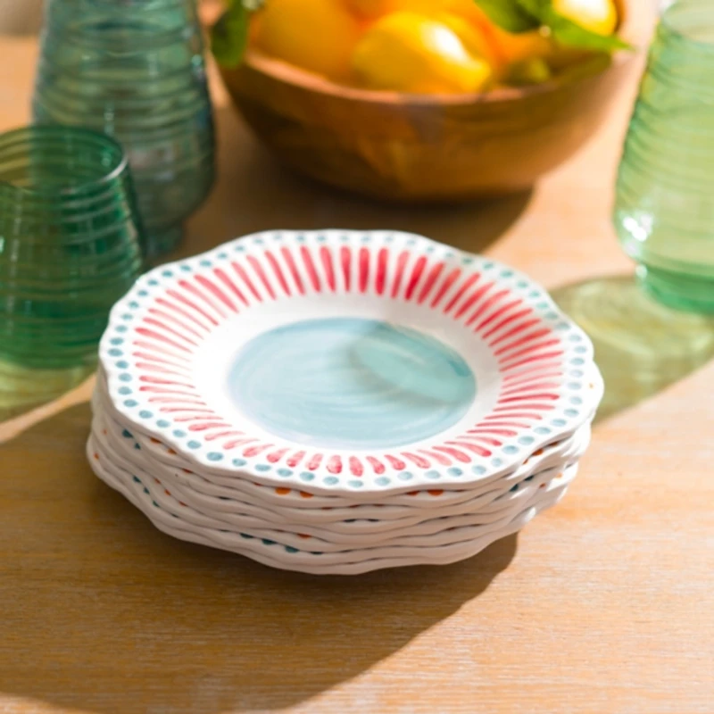 Our Aqua and Pink Dotted Melamine Salad Plate will suit a variety of dinner party themes, from enchanting garden to Italian summer! The line patterns, playful dots, and organic shape create a bold, whimsical design. Plate measures 9 in. in diameter Crafted of melamine Dot and line patterns Organic shape Hues of aqua, pink, and white Food safe Care: Dishwasher safe for top rack only. Not microwave or oven safe. Contact your local Kirkland's store for availability. Quantities and selection may vary by location.