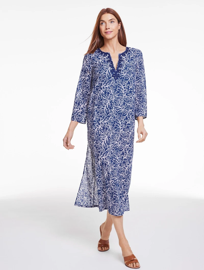 Make a statement from beach to boardwalk in this charming caftan cover-up. In a maxi length that drapes beautifully. Crafted with a split neck and side slits at the hem.