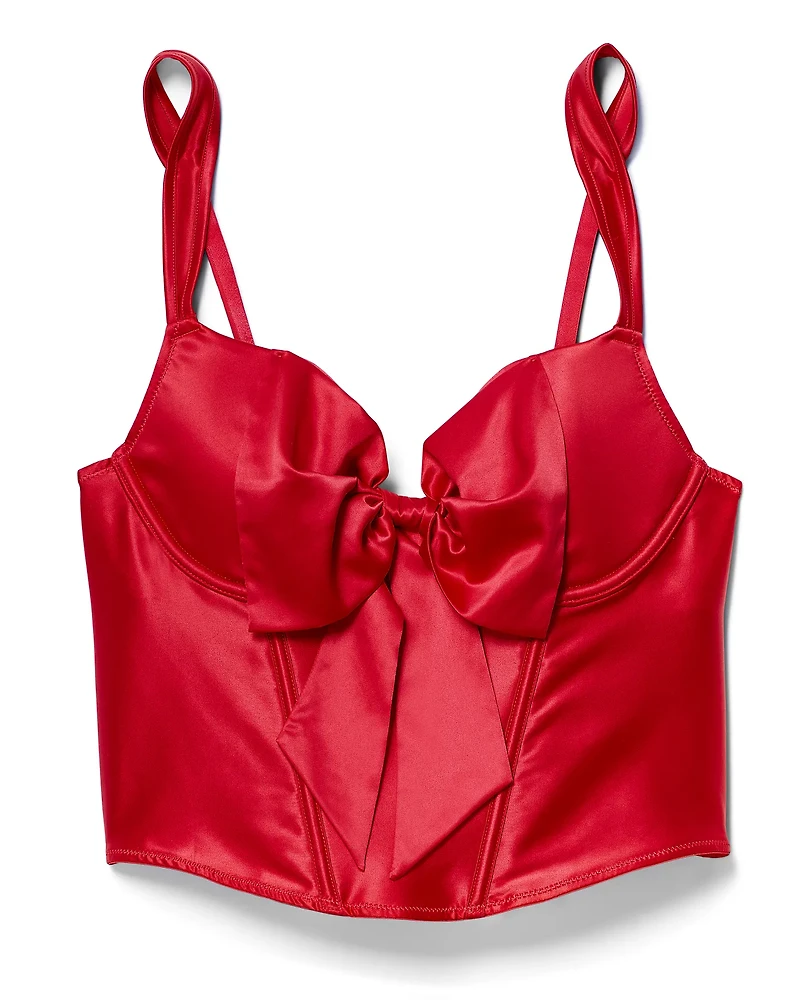 Embrace your festive side in this classic bustier! It's fully lined (giving you coverage & making this bustier completely wearable)! featuring soft satin, mesh back panels, and a matching Brazilian panty in a deep red hue. With a big bow in front that'll make you into an extra-hot Christmas present, the Arianna corset is sure to wow on a night in, or even a night out. (Available in sizes 30A-46DDD.)