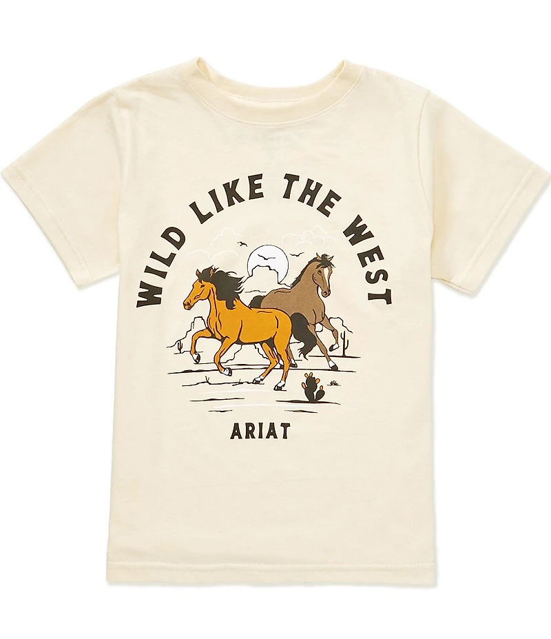 From Ariat, this t-shirt features: Round neckline Short sleeves "Wild Horses" graphic plus "Wild Like The West" verbiage and "Ariat" logo on the front Pullover styling Cotton Machine wash/tumble dry Imported.