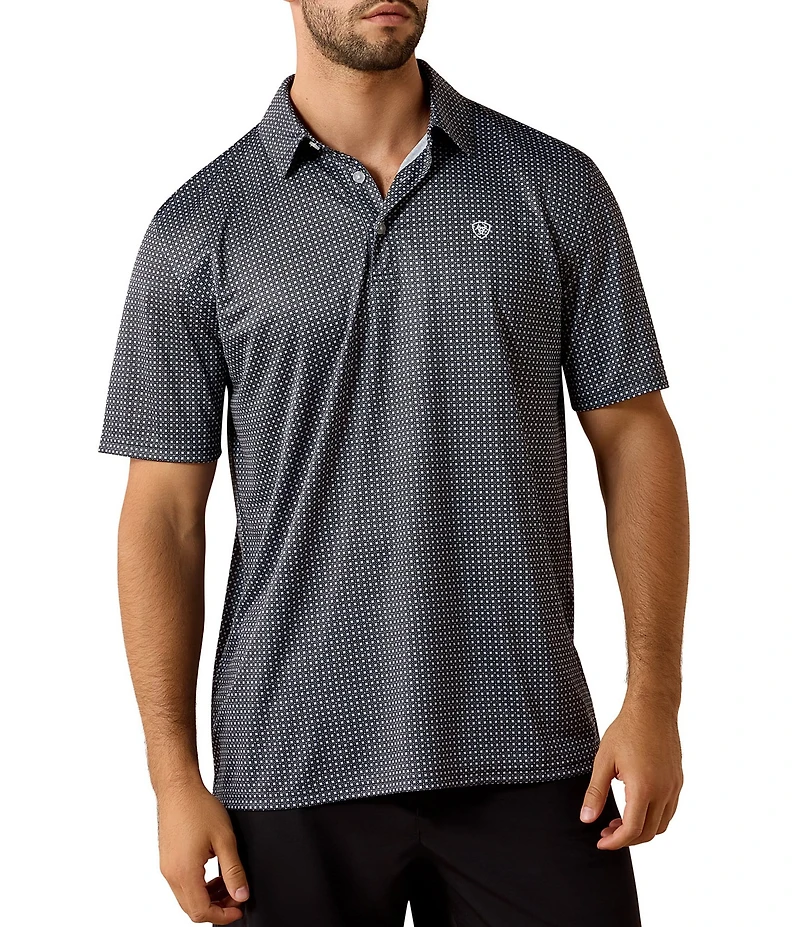 From Ariat, this polo shirt features: Pinwheel geometric print Collared neckline Short sleeves 3-button placket Pullover construction UPF 50 Polyester melangé fabric with MMT™ finish Machine wash/tumble dry Imported.