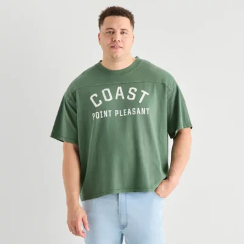 Printed with a front graphic, this men's big and tall t-shirt from Arizona Jeans Co. is an effortless style for your warm weather wardrobe. Cut for a boxy, relaxed-fit, it's made from soft cotton-jersey with a crew neck, drop shoulders, and short sleeves.
