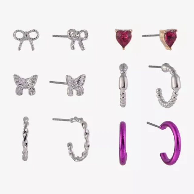 Arizona Silver Tone & Pink Womens Bow Butterfly Heart 6 Pair Earring Set