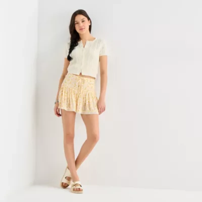 This Arizona women's and junior's skort is a striped style perfect for everyday preppy looks. Made from a woven blend, this short skirt has built-in shorts, a drawstring waistband and a flared peplum skirt with an eyelet trim. Wear it with a fitted tee or a tank top.