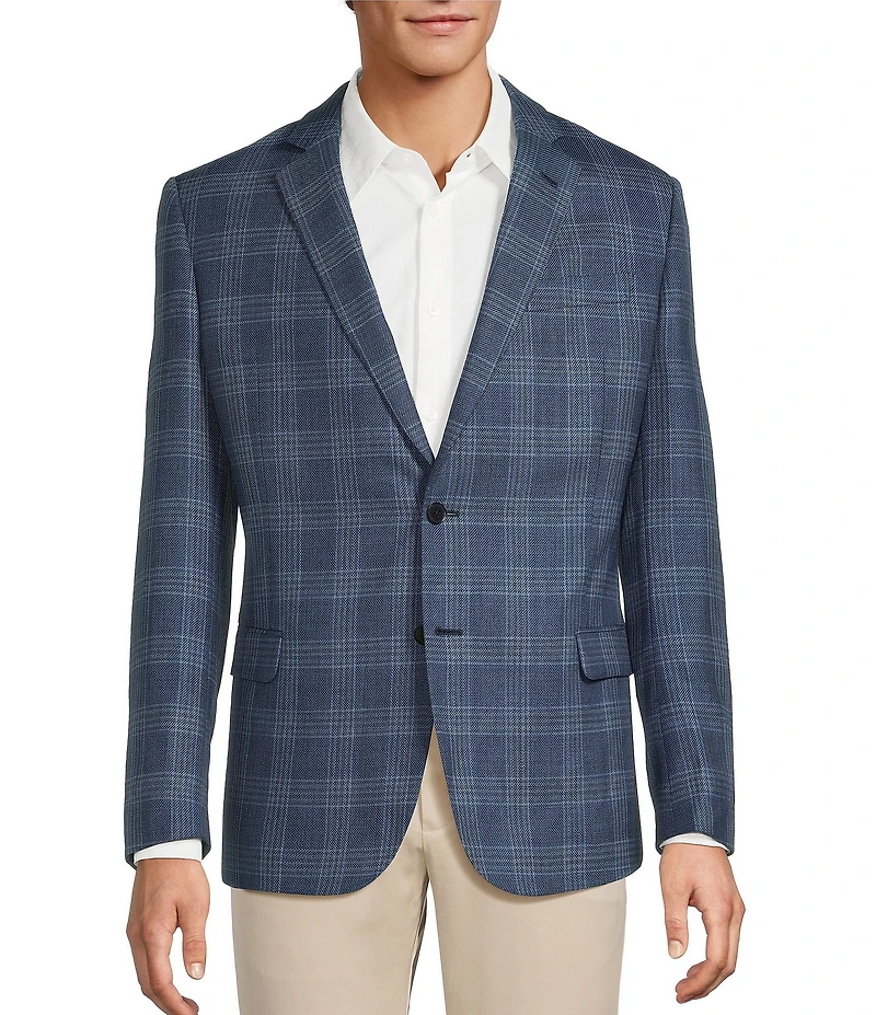 From Armani Exchange, this sport coat features: Trim fit Notch lapel Long sleeves 2-button front closure Flap pockets Side vents Plaid pattern Wool Dry clean Imported.