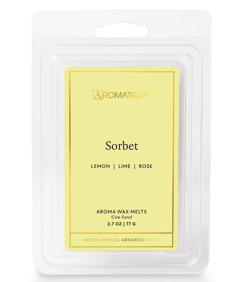 Sorbet Aroma Wax melts are fragranced with elements of lemon and lime entwined with peach, melon, and rose. Aromatique Wax Melts contain a set of 8 cubes made from 100% food-grade paraffin wax and a highly fragrant aroma - no wicks or flames needed. Directions: To use, simply break off a portion of the wax melt and place in your favorite warming device for a room-filling aroma. Fragrance Notes: Lemon, Grapefruit, Lime, Ginger, Musk, Floral Details: White wax; 2.7-oz. net weight; 8 cubes per tray