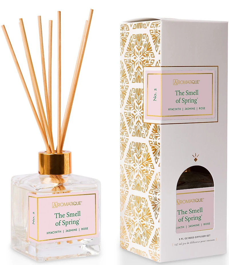 The Smell of Spring Reed Diffuser set allows for the continuous release of fragrance over months at a time. Filled with floral fragrances of hyacinth, jasmine and rose, touched lightly with lily of the valley - this reed diffuser is the perfect no-flame, fragrant accent to your favorite space. Set Includes: Reeds 5 oz. Smell of Spring Diffuser Oil Glass Bottle Directions: Place diffuser bottle on a flat surface. Insert reeds. Let oil absorb for 6-12 hours. To maximize fragrance, invert reeds as needed. Replace reeds as necessary. Fragrance Notes: Pineapple, Green Hyacinth, Jasmine, Rose, Lily of the Valley, Balsamic, Vanilla Details: 8-10 weeks of use time; Glass Bottle w/ Diffuser Oil 5 fl. oz. (boxed); Reeds