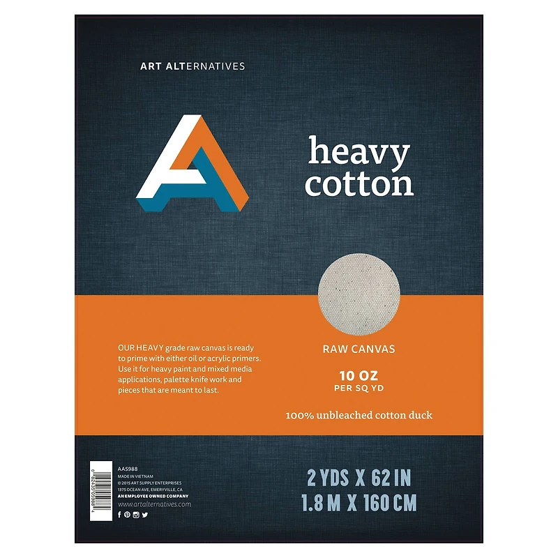 This 10 oz. natural, unbleached cotton canvas comes in a two-yard fold. It's ideal for both students and professionals and is easy to transport. Can be primed with either oil or acrylic primers. Great for use with oils, acrylics, alkyds, spray paint or other painting mediums.Details:White62" x 2yd. (157.5cm x 1.83m)10 oz. per square yardUnprimed canvasCotton