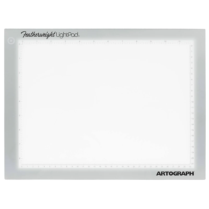 The Featherweight LightPad is a light-weight, portable lightbox that is super bright and ultra-thin. The brightness is easily adjustable, and the dimmable light varies from 500 to 7500 lux. The durable lighted area illuminates evenly with inch and centimeter markers. The bright LED lights last up to 25,000 hours. Useful for tracing or transferring an image for patterns, tattoo design, illustrations, animation, diamond painting, sewing, quilting or embroidery, Energy-efficient LED lights.Details:White9" x 12"LightweightPortableAdjustable brightness (varies from 500 to 7500 lux)Includes inch and centimeter makersLight lasts up to 25,000 hoursSoft protective sleeve is provided for storage
