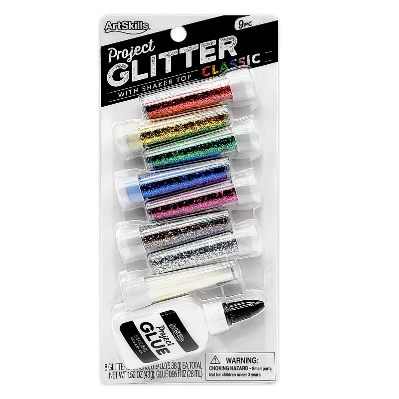 These ArtSkills Glitter Shakers add colorful shine to any poster, project, or slime! The high-quality, ultra-fine glitter comes in a shaker bottle with a convenient flip-top lid. Just apply included Craft Glue where some sparkle is needed, shake out the desired amount of glitter, and tap off the excess over a container for easy cleanup. Colors include red, gold green, blue, purple, rainbow, silver and white.