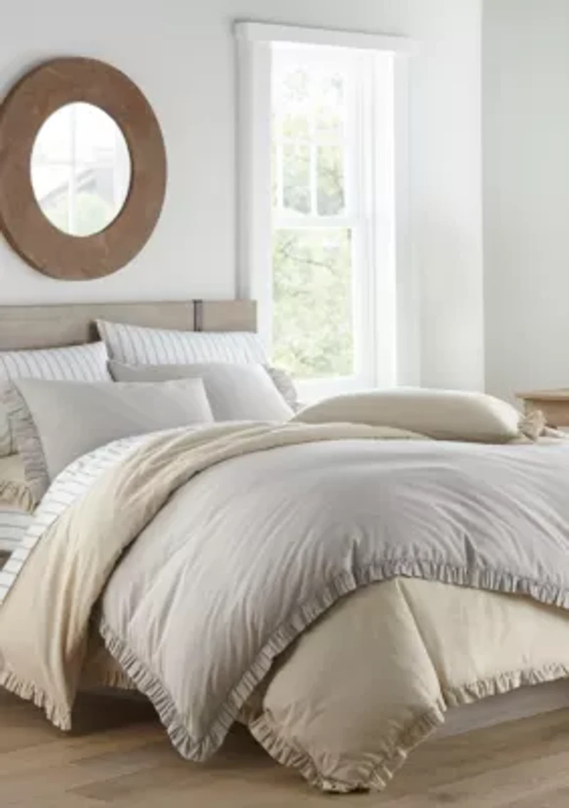 Rethink the basics and create a country casual mood with this solid bedding set by Stone Cottage that is timeless yet modern. The soft, all-cotton comforter and shams give a modern nod to cottage style with a double ply ruffle trim. Full/Queen Duvet Set Includes: 1 Duvet Cover: 96 in L x 92 in W 2 Standard Shams: 21 in L x 27 in W King Duvet Set Includes: 1 Duvet Cover: 96 in L x 110 in W 2 King Shams: 21 in L x 37 in W 3-piece set Imported Material & Care Cotton Machine washable