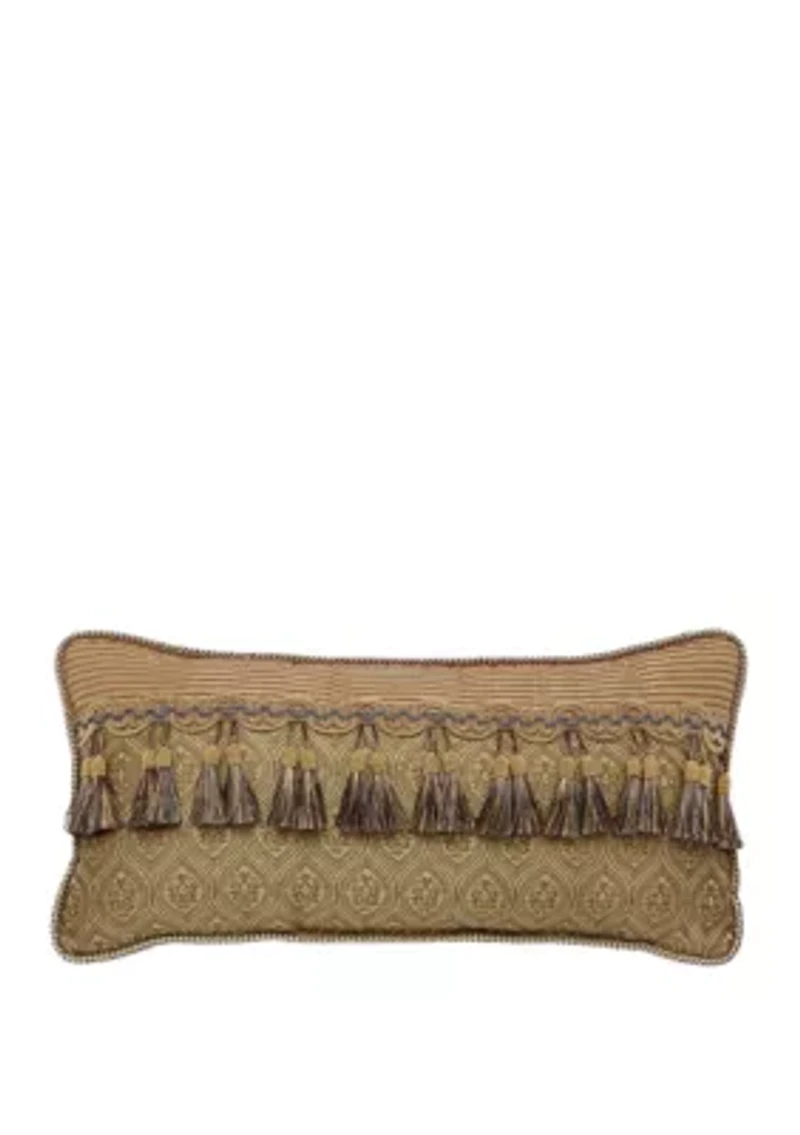 Trimmed with a small cord, this reversible Ashton Boudoir pillow by Croscill joins the striped woven to the ogee woven with a beautiful tassel fringe. Imported Product Specifications 22 in x 11 in Material & Care Polyester Spot clean only