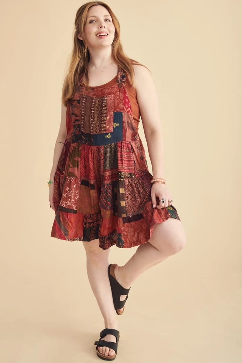The perfect unique spring break outfit with endless ways to wear and layer, this bohemian style patchwork overall skort romper is made for days when comfort and personality go hand in hand. Crafted in India, this overall-style skort features rich, dark red overdyed patchwork with assorted fabric patches, giving each piece a perfectly lived-in look and ensuring no two are exactly alike. The layered patchwork design adds texture and depth while keeping the vibe relaxed and free-spirited. Designed with adjustable coconut button straps, the fit is easy to customize and comfortable for all-day wear. Coconut buttons at the hips add a thoughtful, handcrafted touch, while a front chest pocket and two side hip pockets bring just the right amount of function. The skort silhouette gives you the look of a skirt with the ease and coverage of shorts, making it ideal for movement, wandering, and spontaneous plans. Perfect for festivals, spring break adventures, farmers’ markets, and everyday boho outfits, this overall skort romper pairs effortlessly with tanks, tees, long sleeves, or lightweight layers. Worn with sandals or boots, it captures that carefree, creative energy that makes bohemian style feel fun, wearable, and endlessly expressive. Each piece has been carefully dip-dyed to create a unique colorway for a vintage look you’ll love! Color may wear off on other fabrics, wash separately in cold water and hang to dry.