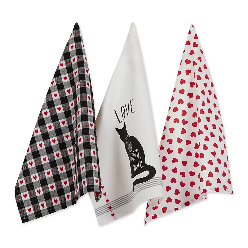 Set of 3 dishtowels measures 18 x 28 inches to tackle all of your drying and cleaning kitchen tasks. Designed with hanging loop for convenient storage and drying. 100-percent cotton fabric, machine wash in cold water on gentle cycle. Tumble dry on low. Iron on low heat as needed. Do not bleach them or dry on high heat. The festive kitchen towels coordinate with most kitchen decor and create a holiday kitchen during the Valentine's season. Great gift for Valentine's day, Holidays, Mother's Day, Dinner Parties, Birthdays, Hostess gift, Housewarming and more. We offer an assortment of quality home and kitchen products including tablecloths, table runners, cloth napkins, napkin rings, placemats, dishtowels, oven mitts and potholders.