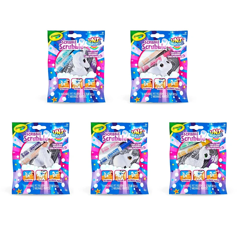 This item is assorted. Style/color will vary and is selected at random. Color a world of mythical creatures with the Crayola Scribble Scrubbie Uni-Creature Pet. This mythical creature toy set allows children to color, wash, and color again their very own uni-creature. The washable markers included in the set make it easy for kids to bring their imagination to life. Scribble, Scrub, and Scribble again! After playtime, the colors can be washed off, ready for a new design next time. This creative toy set is safe and nontoxic. The Scribble Scrubbie Uni-Creature Pet makes a great stocking stuffer, easter basket stuffer, party favor and more. Collect more Crayola Scribble Scrubbie Pets (sold seperately) for an excellent bundled gift for children who love to play and create. Details: Available in assorted styles 1 Uni-Creature (style will vary) SCRIBBLE SCRUBBIE PETS: This 1 Count Scribble Scrubbie Pet includes 1 Uni-Creature pet figurine, two washable markers, and one scrub brush. UNICORN TOYS: Collect all five unique Uni-Creature pets to expand your Scribble Scrubbie Mythical Creature collection. COLOR & WASH: Color your pets with the included markers, then wash them and start again for endless fun! CRAYOLA SCRIBBLE SCRUBBIE APP: Enhance your play experience with the Crayola Scribble Scrubbie App, available on Apple and Android devices. GIFTING MADE EASY: These little pets make perfect gifts, from Christmas stocking stuffers and Easter basket stuffers to birthday party favors. For ages 3 and up