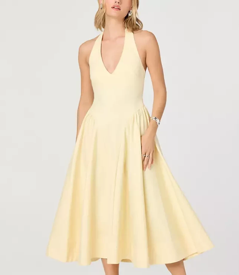 The Meana Dress is a V - neck halter mini dress, with a fitted waist and gathered full skirt at hips. Adjustable tie at back neck. Back zip This item can only be exchanged or returned by mail., Imported:, Length: 33"from shoulder to hem, Fabrication: 50% Cotton 47 Nylon 3 Elastane, Garment Care: Dry Clean Loft Astr The Label Meana V - Neck Halter Mini Dress Size XS Lemon Women's by Loft Size Regular - XS Lemon Women's A - line, Dresses Dressy 50% Cotton 47% Nylon 3% Elastane Dry Clean