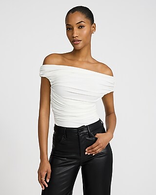 Your new favorite going out style, this bodysuit features a flattering ruched bodice and an asymmetrical off the shoulder neckline.