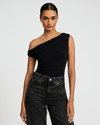 Your new favorite going out style, this bodysuit features a flattering ruched bodice and an asymmetrical off the shoulder neckline.
