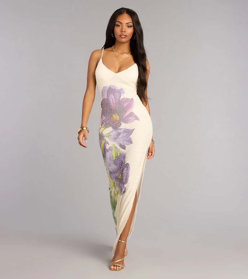 Special Occasion Romantic with a modern edge, the Athena dress is designed to glide through the evening with effortless allure. A floral pattern of bead and sequin detailing enhances the form-hugging silhouette, finished with a high side slit that brings movement and quiet drama. Fit & Features Floral pattern, sequin, bead mesh-lined fabric V-neckline, spaghetti straps High side slit Form-hugging long silhouette Runs true to size   Where to Wear: Prom, birthdays, special date nights, vacations, resort destinations, cocktail soirees