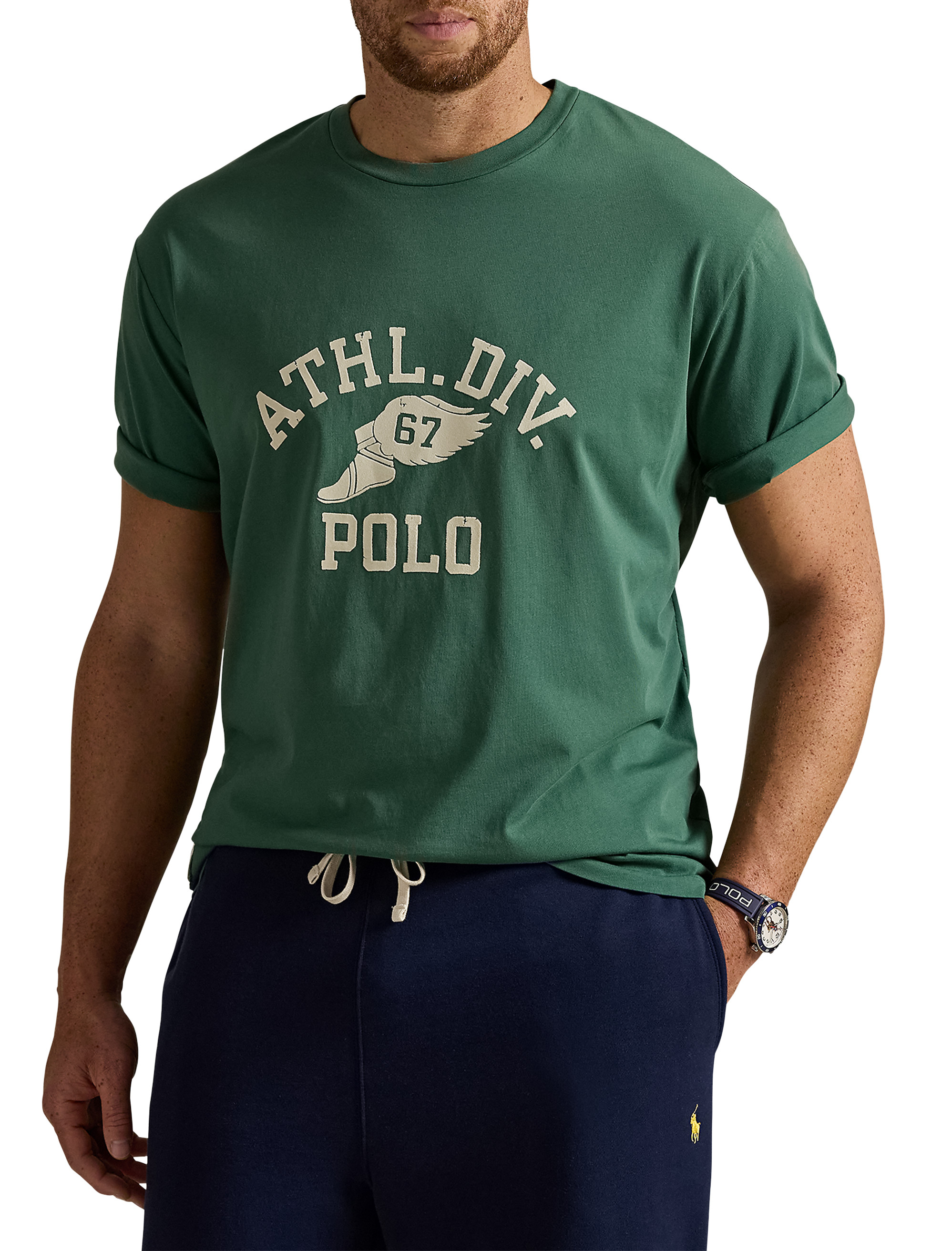 - "Athl. Div.," winged foot graphic with "67," and "Polo" crackle-printed at the center chest
