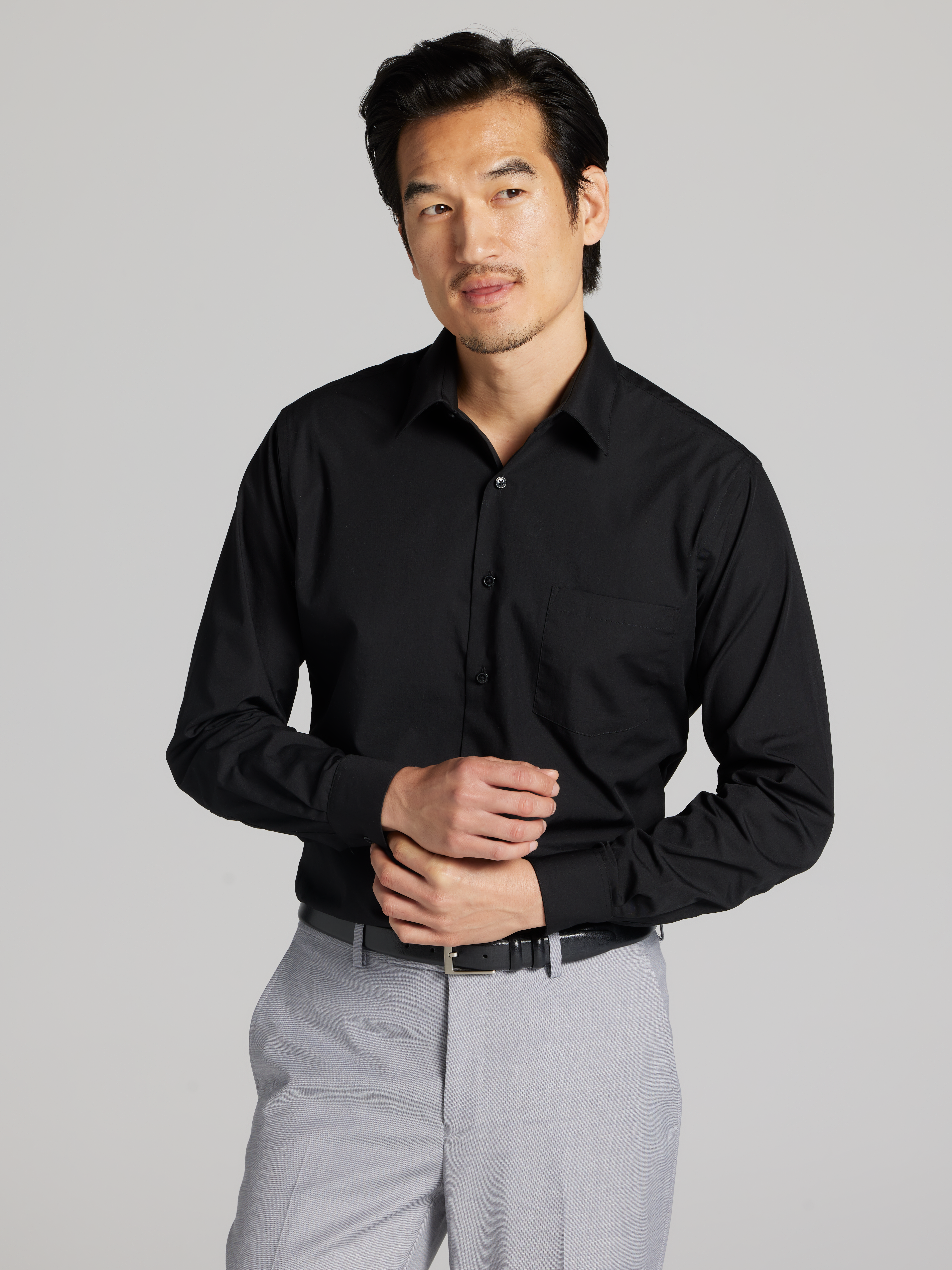 This Van Heusen dress shirt offers a tailored silhouette that complements an active build. Crafted from lightweight, breathable poplin, it features a classic point collar and slightly tapered sleeves and waist for a closer fit without sacrificing comfort. Sharp, versatile, and ready for work or weekend wear.