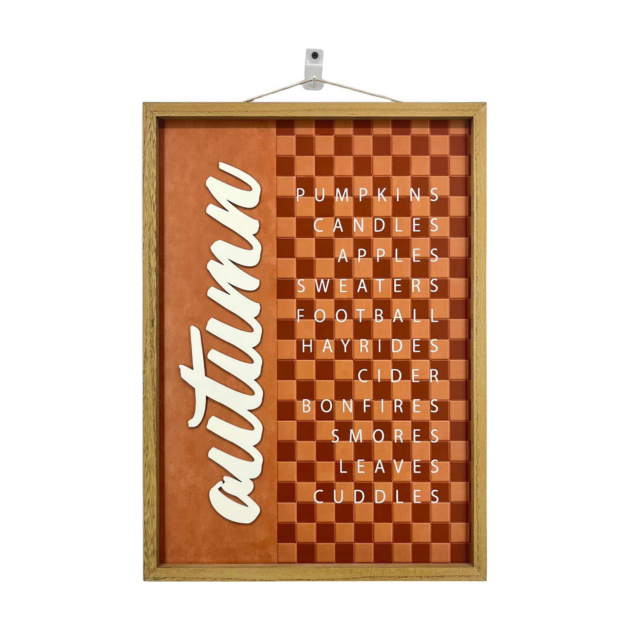 The sign features a rustic wooden frame that perfectly complements the rich, autumnal hues of the background. The left side of the sign proudly displays the word "autumn" in elegant, flowing script, capturing the spirit of the season. The right side is adorned with a delightful checkered pattern in varying shades of orange, creating a visually appealing contrast that adds depth and texture.