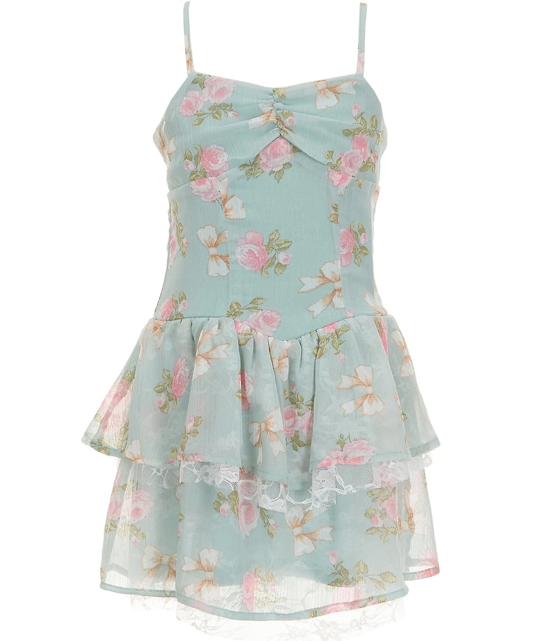 Ava & Yelly Big Girls Spaghetti Strap Sweetheart Neckline Floral Print Tiered Lace Detail Dress