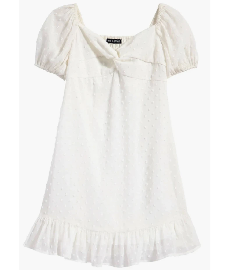 From Ava & Yelly, this dress features: Clipdot fabric Square neckline Puff sleeves Twist front detail Ruffle hem Smocked back detail Pullover styling Polyester Machine wash cold/line dry Imported.
