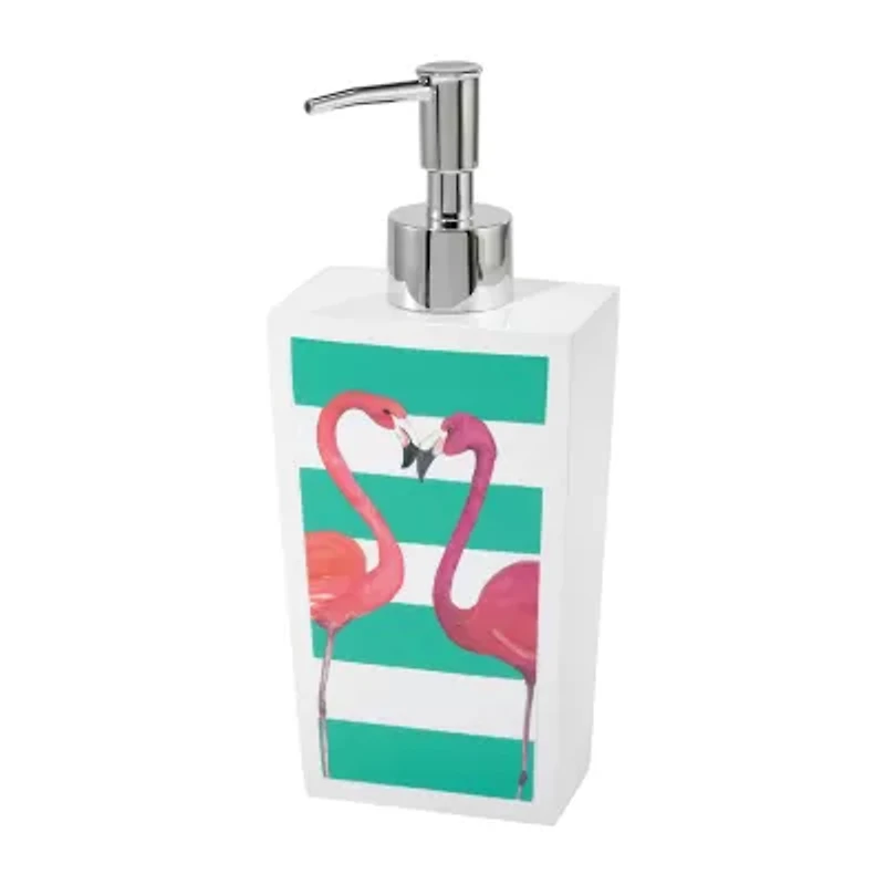 The avanti flamingo paradise lotion/ soap/ sanitizer dispenser features a decal with two pink flamingos beak-to-beak on a green and white striped background. The base is high-gloss white with a shiny silver pump. Made of durable resin for long life and easy care.