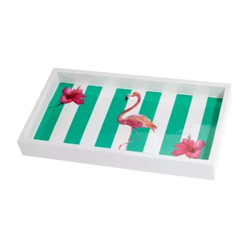 The avanti flamingo paradise tray features a decal with a flamingo and hibiscuses on either side on a green and white striped background. The base is high-gloss white. Measuring 5" x 10", made of durable resin for long life and easy care.