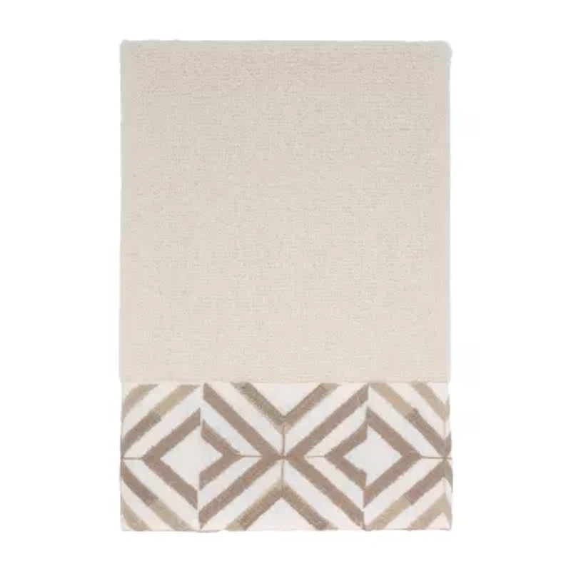 The Avanti Harlow ivory fingertip towel features concentric diamonds intricately embroidered in light and medium brown on a 100% polyester ivory cloth. The ivory tower is sheared for a silky, smooth, shimmering ground, the perfect complement to this contemporary design. Towel measures 11" x 18".
