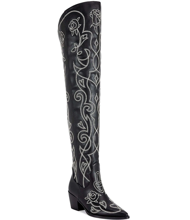 From Azalea Wang, the Kess Western Stitched Thigh High Boots feature: Synthetic upper Classic western stitching featuring roses and hearts Inside zipper closure Synthetic lining Synthetic outsole Approx. 31" boot shaft height Approx. 28" boot shaft circumference Approx. 2.5" heel height Imported.