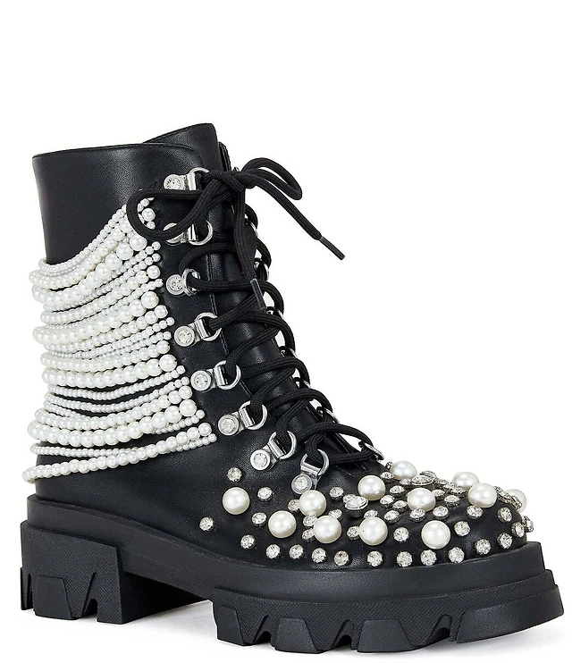 Azalea Wang Twinkley Pearl Studded Rhinestone Embellished Detail Combat Boots