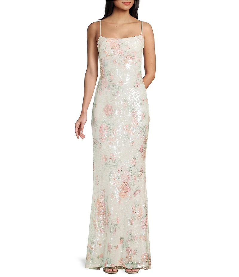 From B. Darlin, this dress features: Floral printed sequin fabric Scoop neckline Spaghetti straps Scoop back Fitted silhouette Zip back closure Approx. 63" length Polyester/spandex; lined Hand wash/line dry Imported.