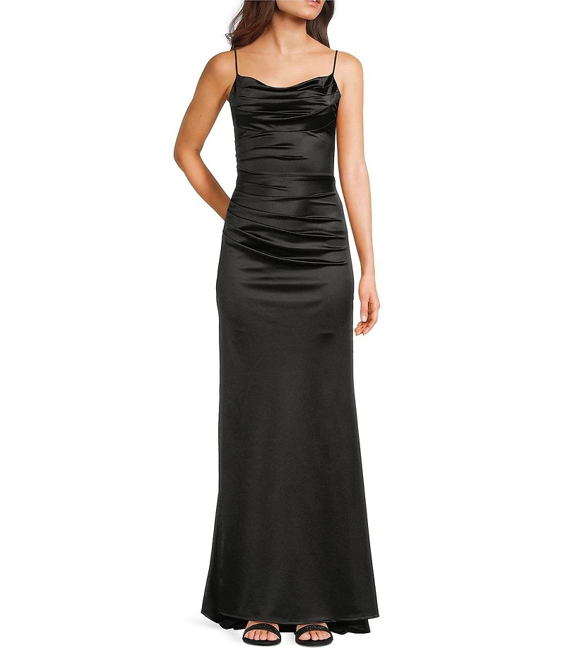 B. Darlin Satin Cowl Neck Shirred Lace-Up Back Long Dress in Chattanooga, TN