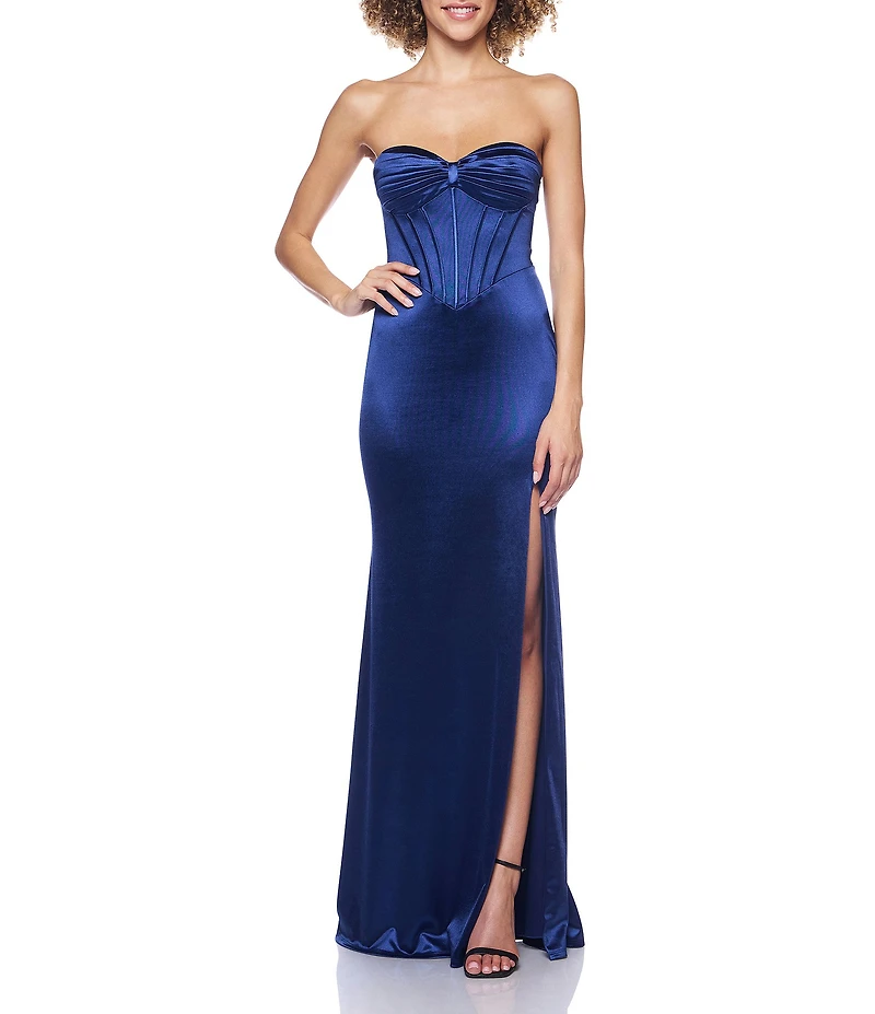 From B. Darlin, this dress features: Heavy knit satin fabric Strapless sweetheart neckline Corseted bustier bodice Side slit Zip-back closure Approx. 64" length Polyester/spandex; lined Hand wash/line dry Imported.